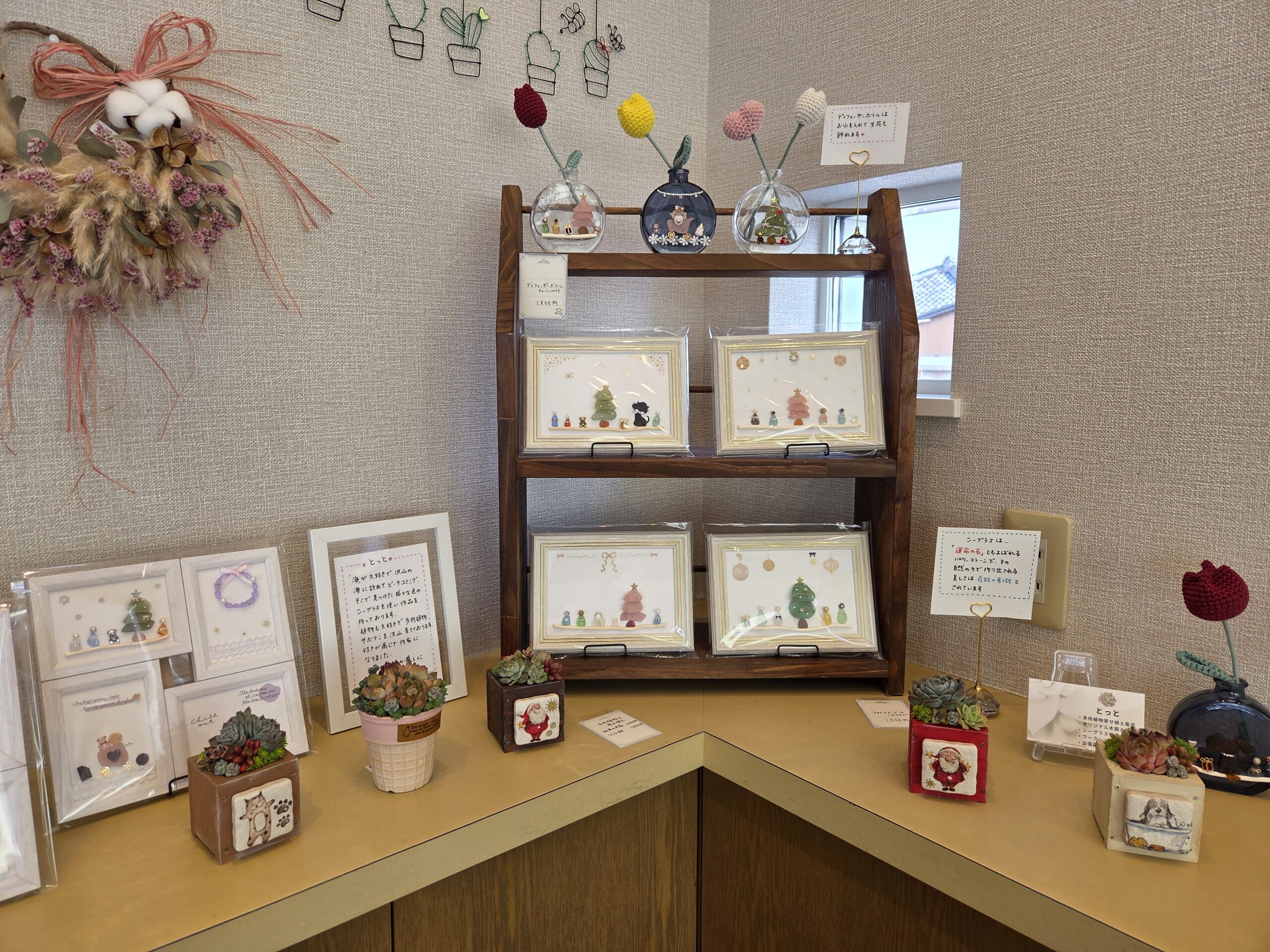 当店では、「サンシギャラリー」を地域で活躍をされている方に貸し出しをしております。12月は 四季の里あおぞらワーク様 作品展 & ドライフラワー作家 華咲美(hanaemi)様「冬の光に包まれて~花と微笑みの時間~」展を展示しておりますのでぜひお立ち寄りください。(華咲美様は11月に引き続きの展示となっております)