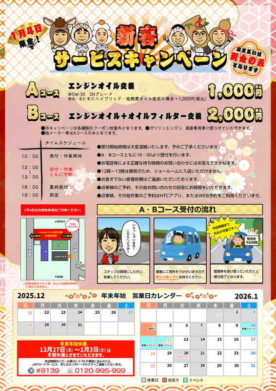 毎年大人気の新春サービスキャンペーン、今年も開催します♪ とってもお得なオイル交換等のお年玉キャンペーンです。 2025年1/4(土)サービスキャンペーンご利用のお客様は、下記画像注意事項をご確認ください。