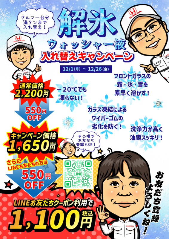 12月に入り、寒さも本格的になってきました。 今シーズンは、いつもの冬より寒くなる予報が出ております。 いざという時に慌てないためにも、早めの備えをおすすめします。 今月のサービスキャンペーン「解氷ウォッシャー液入れ替え…[続きを読む]
