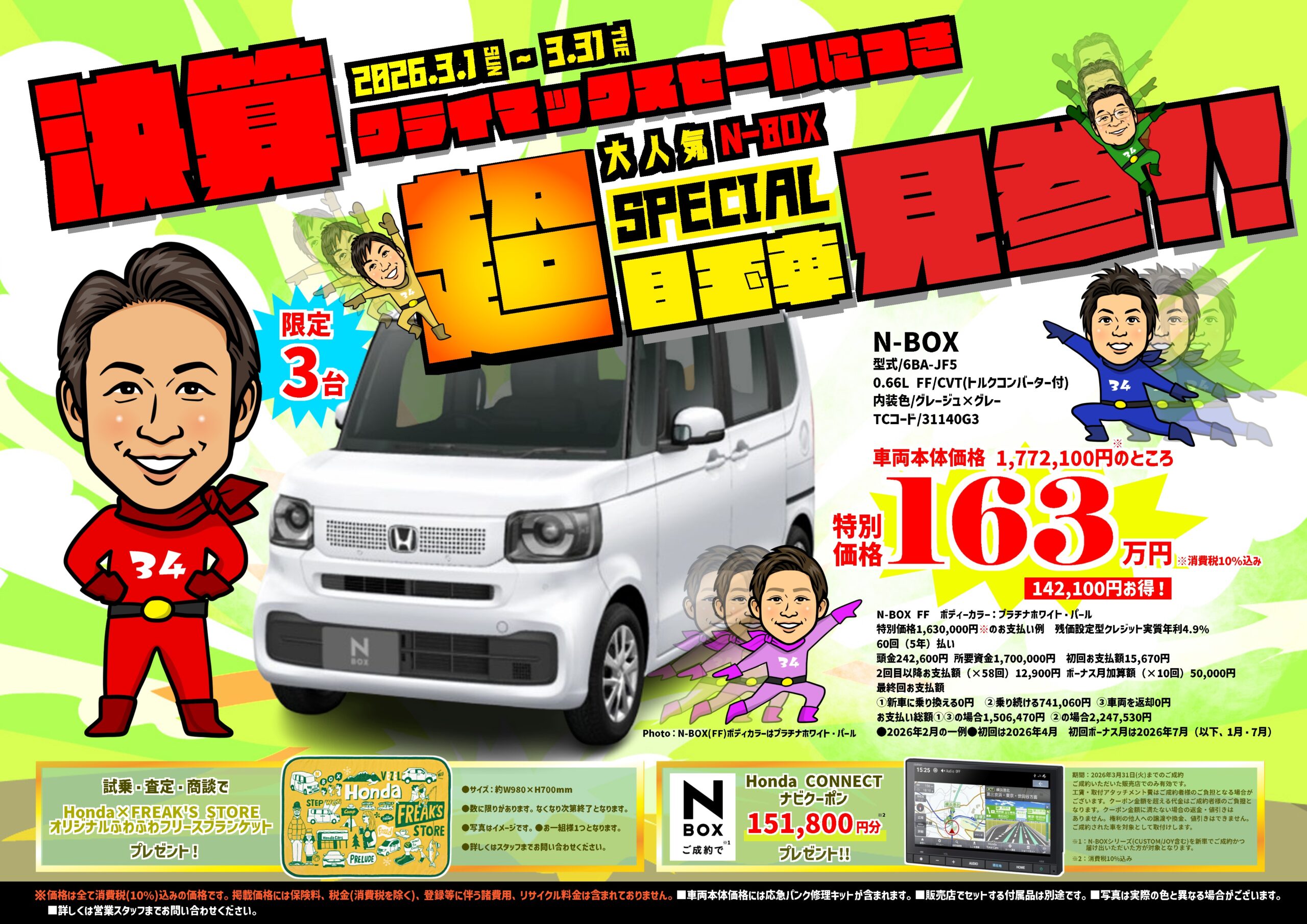 そんな3月に気合の超スペシャル目玉車、見参です!!人気のN-BOXを特別価格にてご用意。